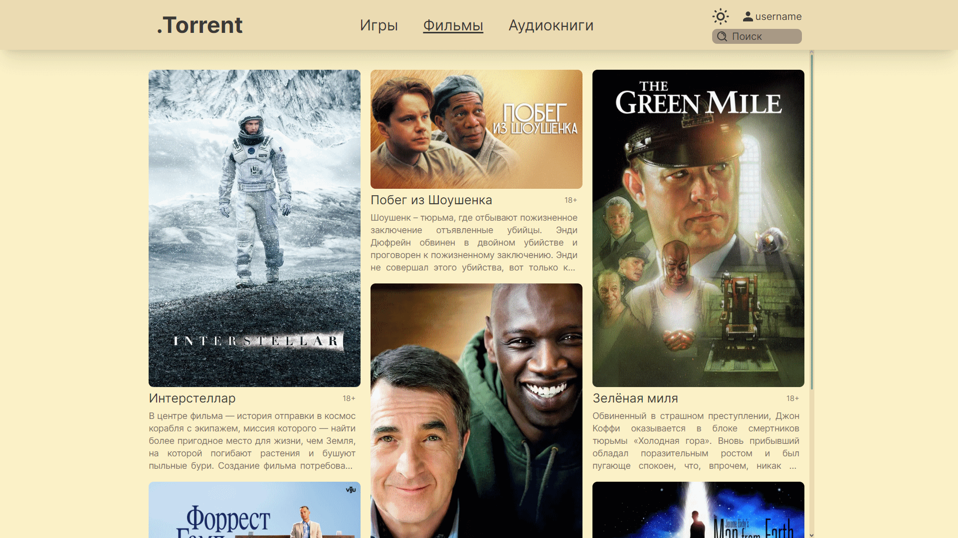 - Главная страница со списком популярных видеоигр, фильмов, аудиокниг